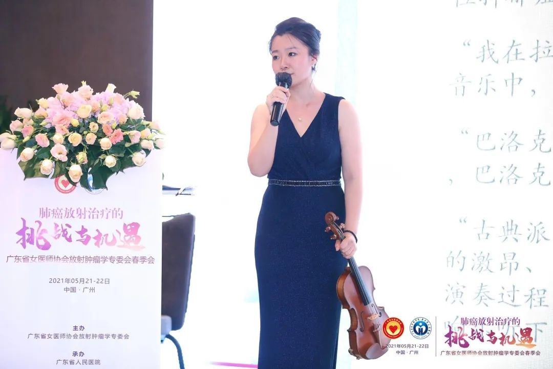 2021年5月21日下午,我院副教授原嫄受广东省女医师协会放射肿瘤学专委会邀请,在“肺癌放射治疗的挑战和机遇”春季会上作题为“艺术与医学的交融共振——旋律治疗的魔力”的学术报告。原嫄副教授就如何推进音乐与医学的交叉学科发展以及音乐美育对人文素养的影响、古典音乐与医学的相互影响等方面作专题报告,并现场演奏经典小提琴作品。