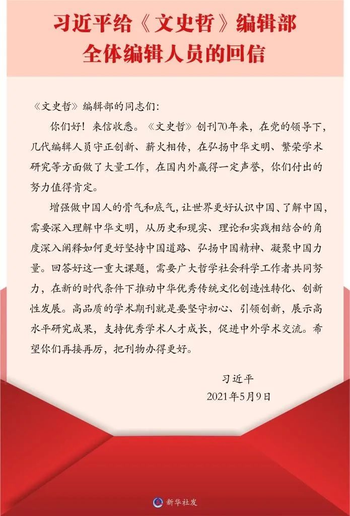 5月10日,中共中央总书记、国家主席、中央军委主席习近平给《文史哲》编辑部全体编辑人员回信,对广大哲学社会科学工作者提出更高要求,也对办好哲学社会科学期刊提出殷切期望。