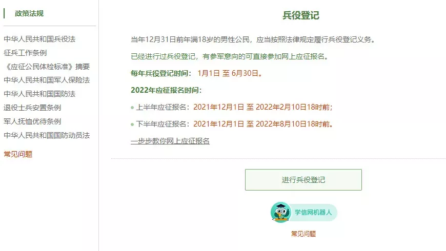 在这个页面中,会告知我们报名时间以及参军的政策说明,建议看后,点击“进行兵役登记”,迈出你军旅生涯的第一步吧!