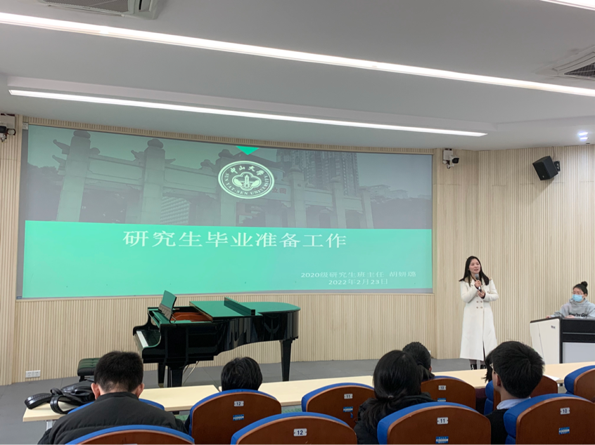 2020级研究生班主任胡妍璐老师就研究生毕业准备工作进行了总结,并详细讲解了我院硕士研究生培养方案中对申请研究生毕业的相关要求以及《教育部关于做好2022届全国普通高校毕业生就业创业工作的通知》,鼓励同学们主动将个人职业发展与国家战略需求相结合,实现更高质量和更加充分就业。