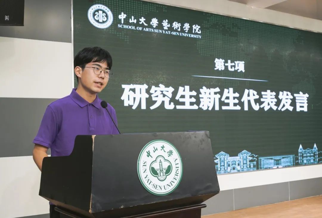 研究生代表王帆同学分别用“action”“reset”“touch”去阐述“art”一词的理解感悟。她表示,身为自己人生的主角,我们要有放手去做的勇气,反复精进技术,用磨砺与奋斗作为人生底色,去接触与感受,自觉与人民同呼吸共命运,与党同心同德,共同书写祖国文艺事业的新篇章。