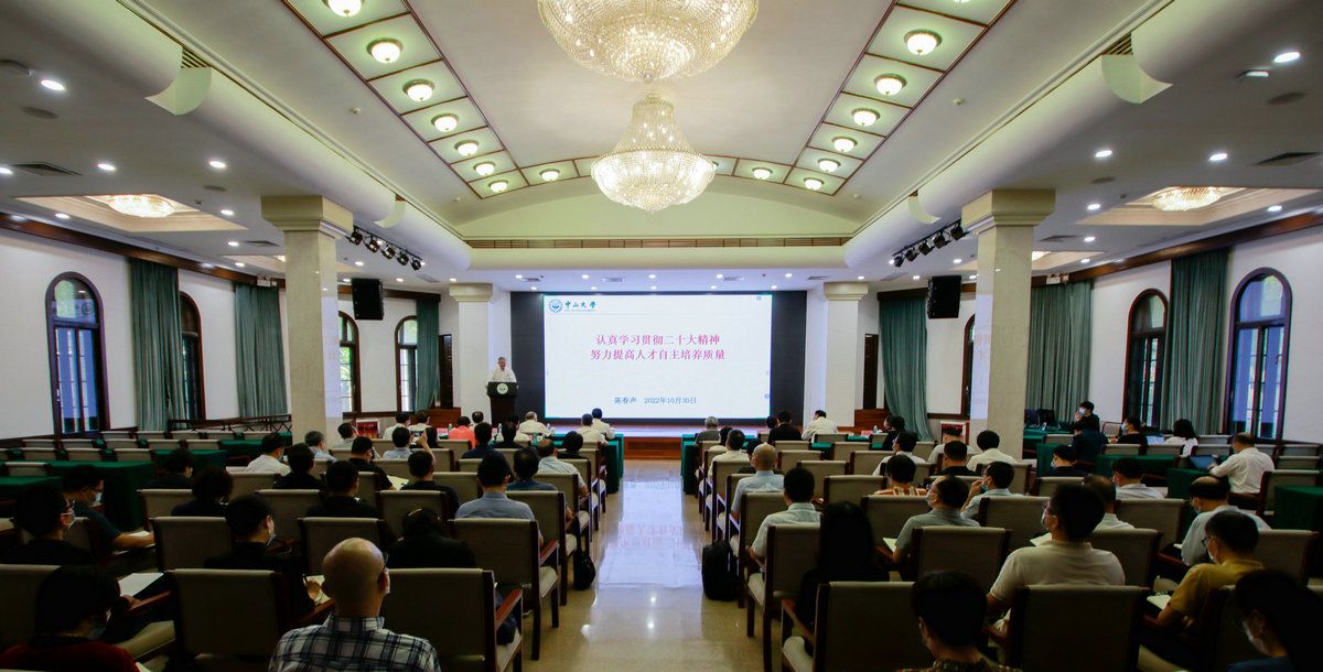 陈春声结合参加党的二十大的切身体会,以“认真学习贯彻党的二十大精神 努力提高人才自主培养质量”为题作传达报告。陈春声首先全面介绍了党的二十大召开的总体情况,重点介绍了大会议程、二十大代表构成、中央纪律检查委员会工作报告及《中国共产党章程(修正案)》和二十届“两委”的诞生过程。他强调,党的二十大是在全党全国各族人民迈上全面建设社会主义现代化国家新征程、向第二个百年奋斗目标进军的关键时刻召开的一次十分重要的大会,是一次高举旗帜、凝聚力量、团结奋进的大会。新征程上,要牢记习近平总书记强调的“四个始终”,踔厉奋发、勇毅前行,努力创造更加灿烂的明天。
