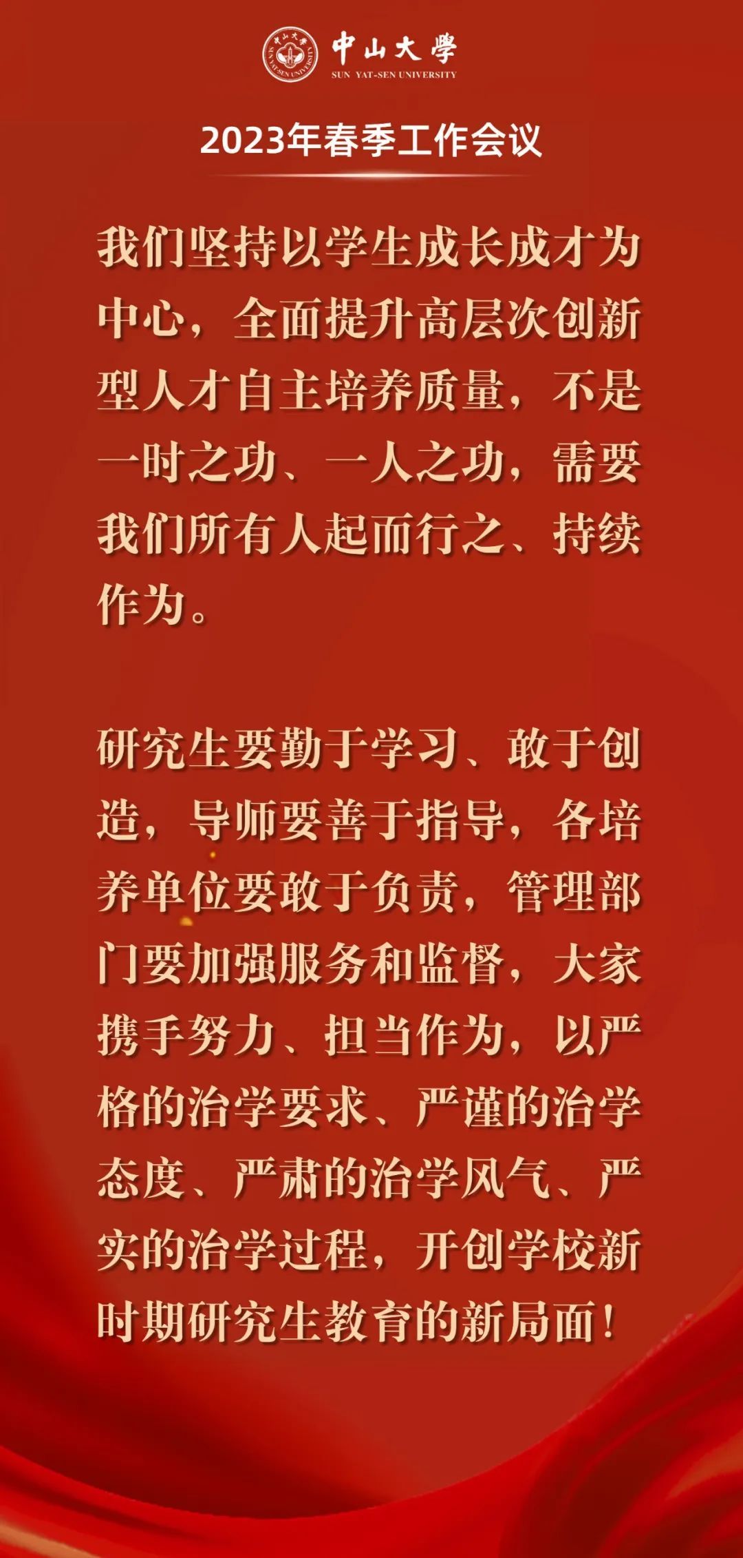 陈春声书记在总结讲话中表示,高松校长对全面提升高层次创新人才的自主培养质量,推动研究生教育改革创新,稳步扎实推进学校高质量内涵式发展提出了明确的发展路径,也为学校人才培养构建完整的系统的顶层设计,在人才培养、队伍建设和体制机制改革等方面,确定了明确的工作目标。相信在全校师生员工的共同奋斗下,学校事业发展一定会更加辉煌!